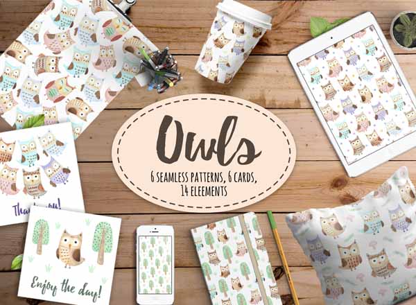 有趣的水彩猫头鹰无缝背景纹理素材[png,psd]