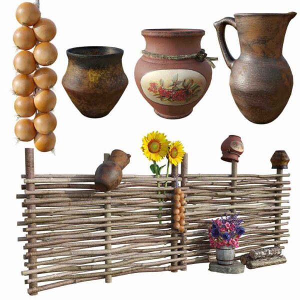 带向日葵花朵和陶罐装饰的木栅栏3D模型(FBX,MAX)
