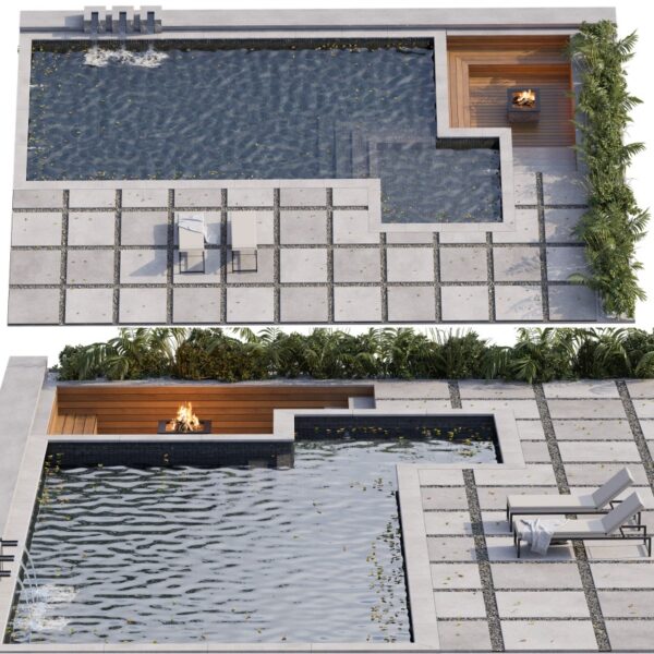 包含绿植 躺椅和篝火的室外游泳池3D模型(OBJ,MAX)