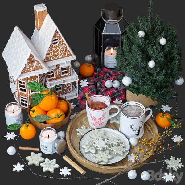 包含姜饼屋 烛台和咖啡橘子等圣诞节食品及装饰组合3D模型(OBJ,FBX,MAX)