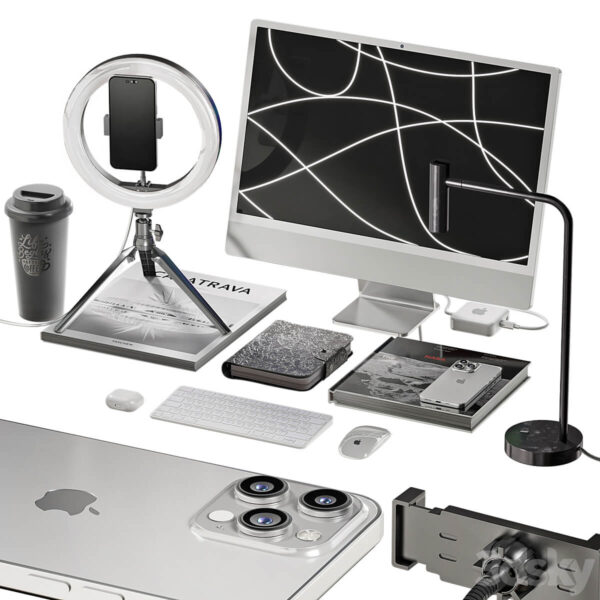 包含电脑 手机 环形灯 咖啡和文具的工作桌面 工作场景3D模型(OBJ,MAX)